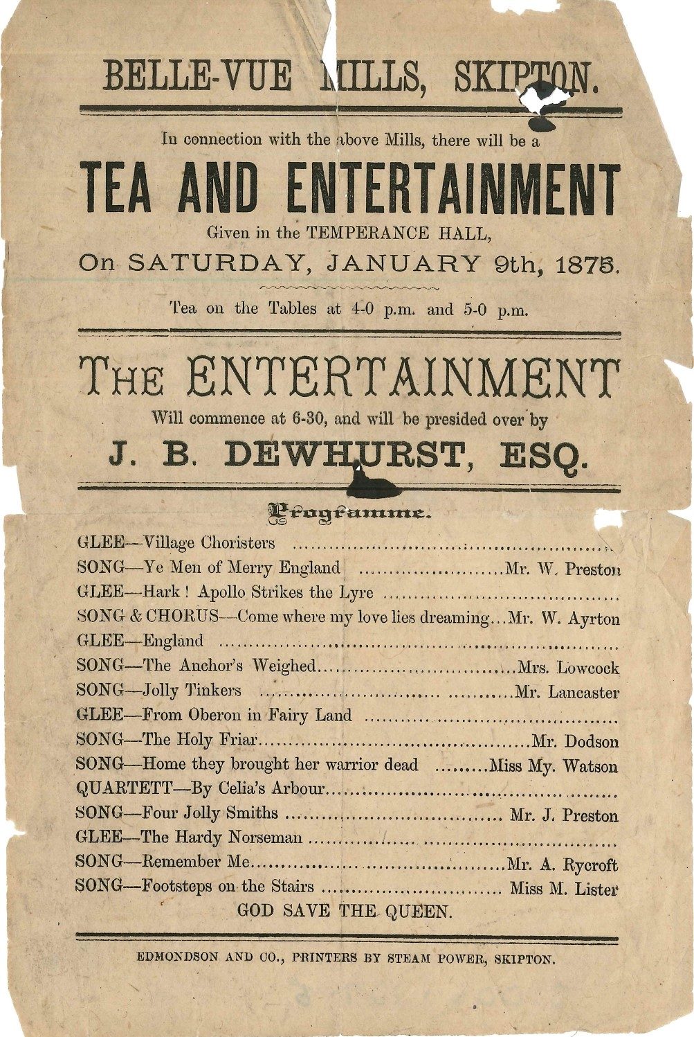 Belle Vue Mill, commonly known as Dewhurst’s, was built by Thomas Dewhurst in 1828. It opened in 1829 as John Dewhurst & Sons and was one of Skipton’s largest spinning and weaving mills.
