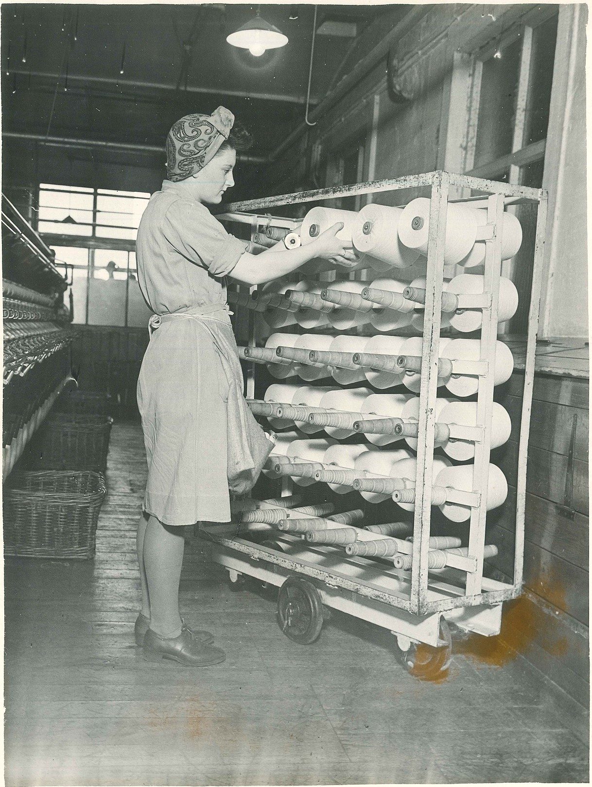 Mill worker weighing a bobbin trolley on a large scale, c.1930s-50s © Skipton Town Hall