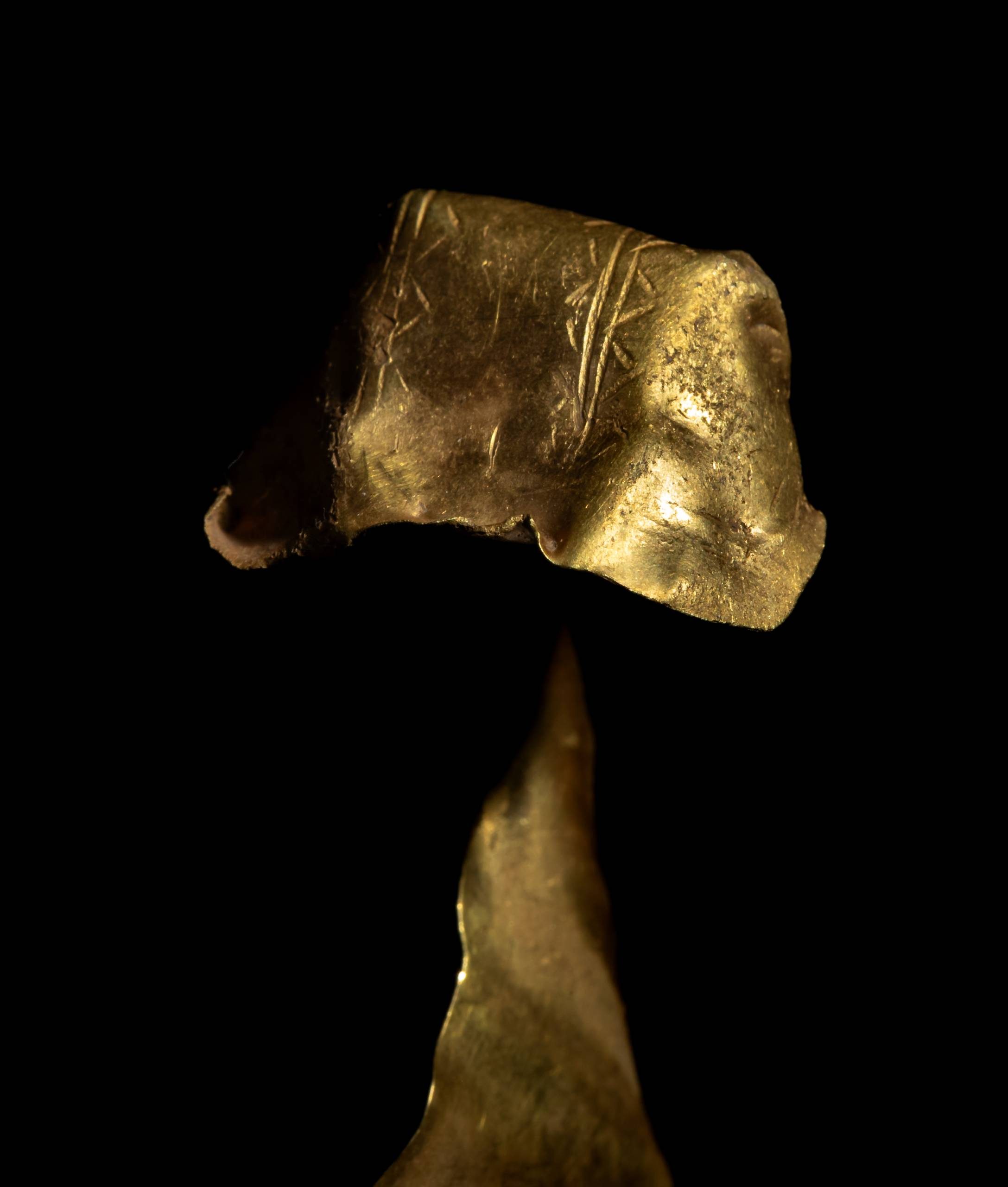 As well as being rolled up, much of the decoration on the lunula has been worn away. It may be that this was done intentionally as a way of ‘decommissioning’ it or for some other symbolic reason before it was deposited.
